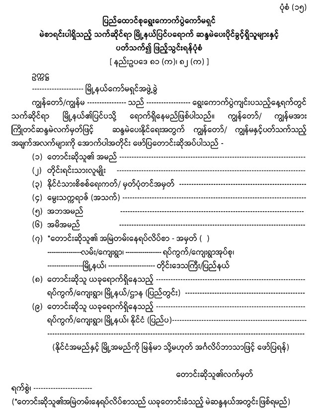 ပြည်ထောင်စုရွေးကောက်ပွဲကော်မရှင် မဲစာရင်းပါရှိသည့် သက်ဆိုင်ရာ မြို့နယ်ပြင်ပရောက် ဆန္ဒမဲပေးပိုင်ခွင့်ရှိသူများနှင့် ပတ်သက်၍ ဖြည့်သွင်းရန်ပုံစံ